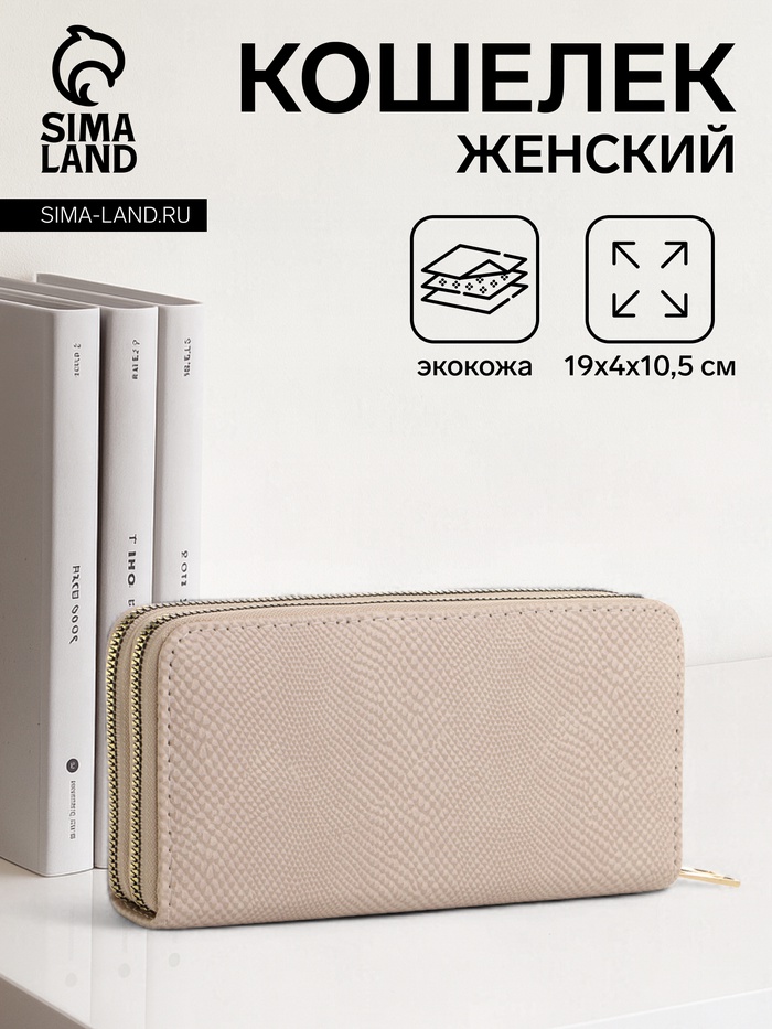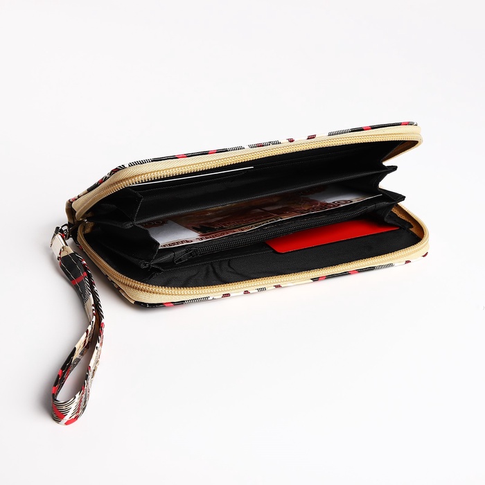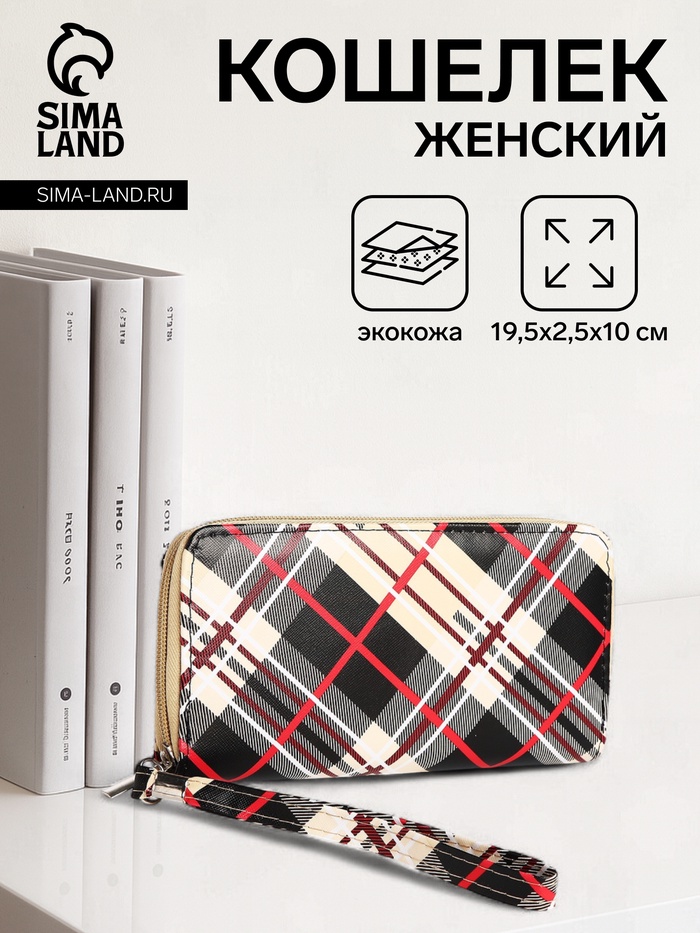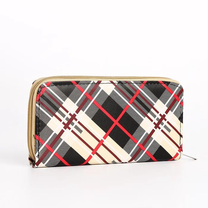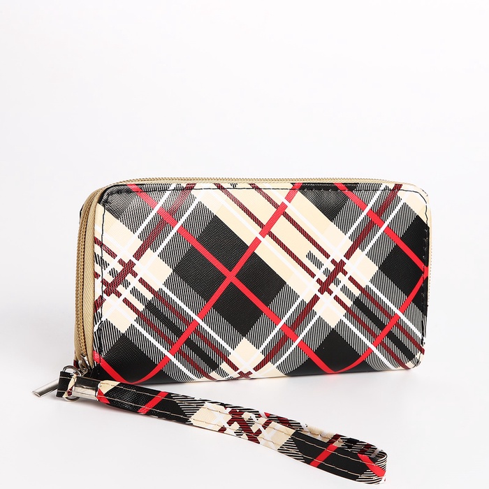 Кошелёк женский на молнии с ремешком, 19.5×2.5×10 см, в клетку, бежевый — Характеристики
