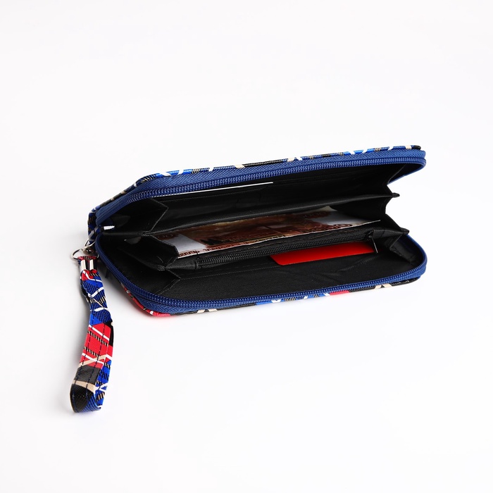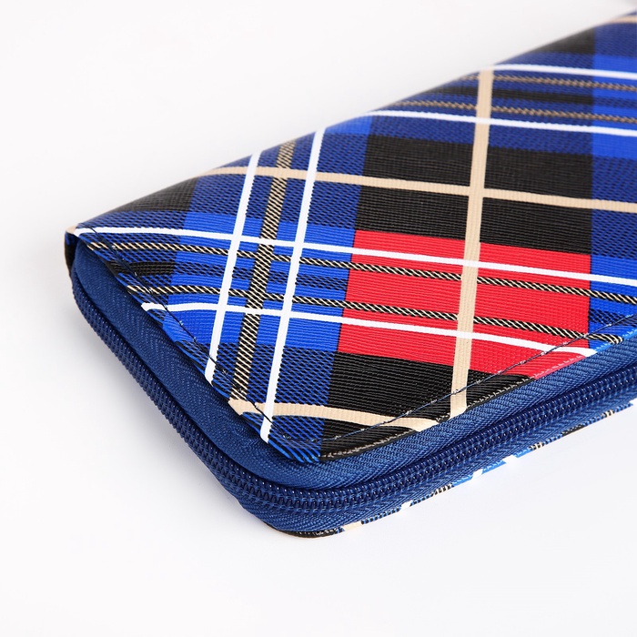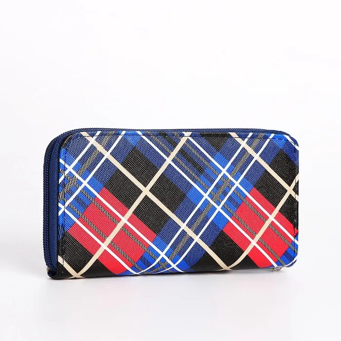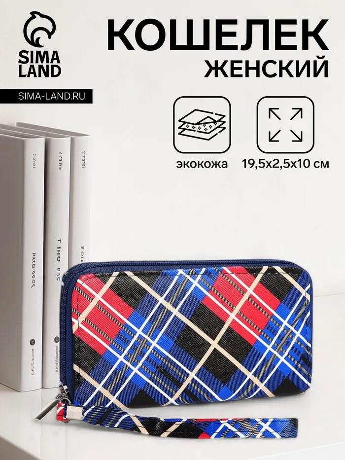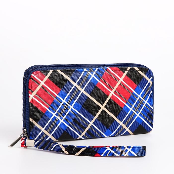 Кошелёк женский на молнии с ремешком, 19.5×2.5×10 см, в клетку, синий — Характеристики
