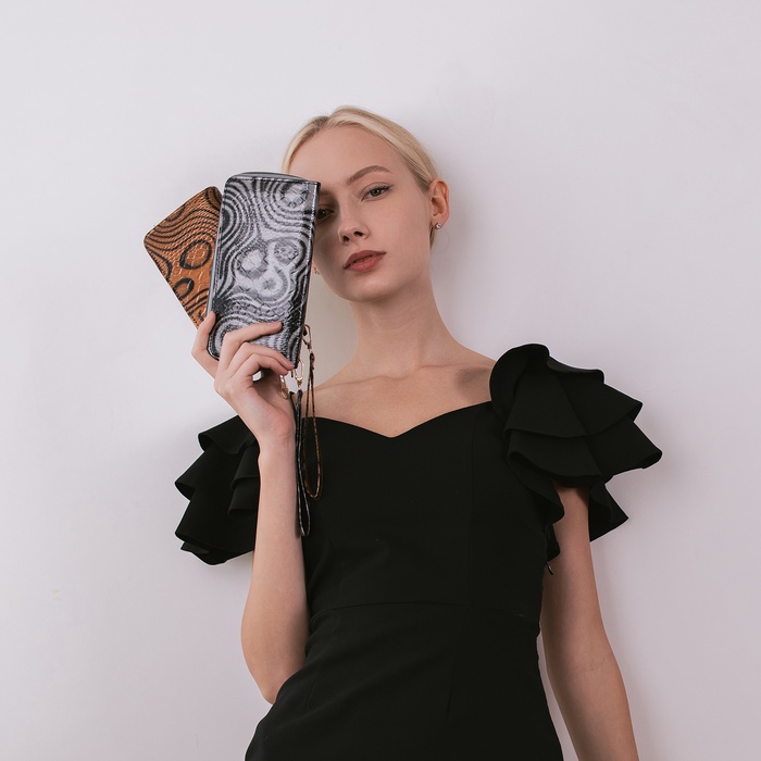 Этот коричневый кошелёк с абстрактным узором сочетает в себе практичность и индивидуальный стиль. Он создан для женщин, которые ценят организованность в деталях и предпочитают аксессуары с характером. Удобный ремешок дает возможность носить его как самостоятельный элемент образа.