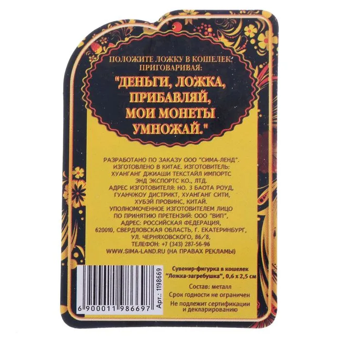 Ложка загребушка — успеха и денег заманушка! Положите загребушку в кошелёк, произнесите заговор, и она принесёт вам море успеха и богатства. Металлический сувенир весом всего 2 г преподносится на эксклюзивной дизайнерской подложке в пакете с европетлёй.