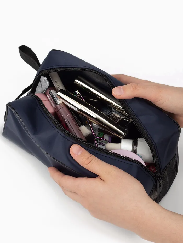 Косметичка на молнии с ручкой, объёмная, большая, тёмно-синяя — Характеристики