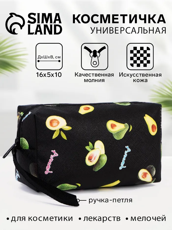 Косметичка на молнии с ручкой, объёмная, маленькая, с рисунком «Авокадо», чёрный — Характеристики