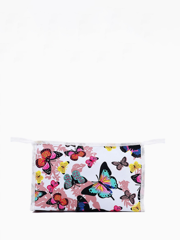 Треугольная косметичка с яркими бабочками — стильный аксессуар для хранения косметики и аксессуаров. Объёмная форма и удобная молния делают её практичным решением для путешествий и повседневного использования. Белый фон с красочным принтом создаёт лёгкое летнее настроение.