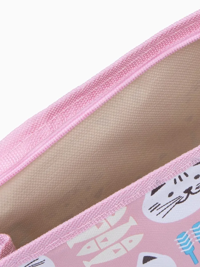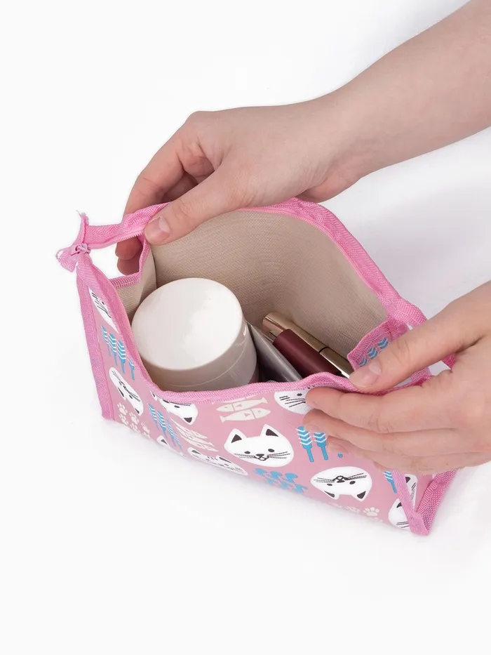 Треугольная косметичка с кошачьим принтом — оригинальный аксессуар для хранения косметики. Розовая искусственная кожа с изображением котов и рыбок создаёт игривый стиль, сохраняя практичность.