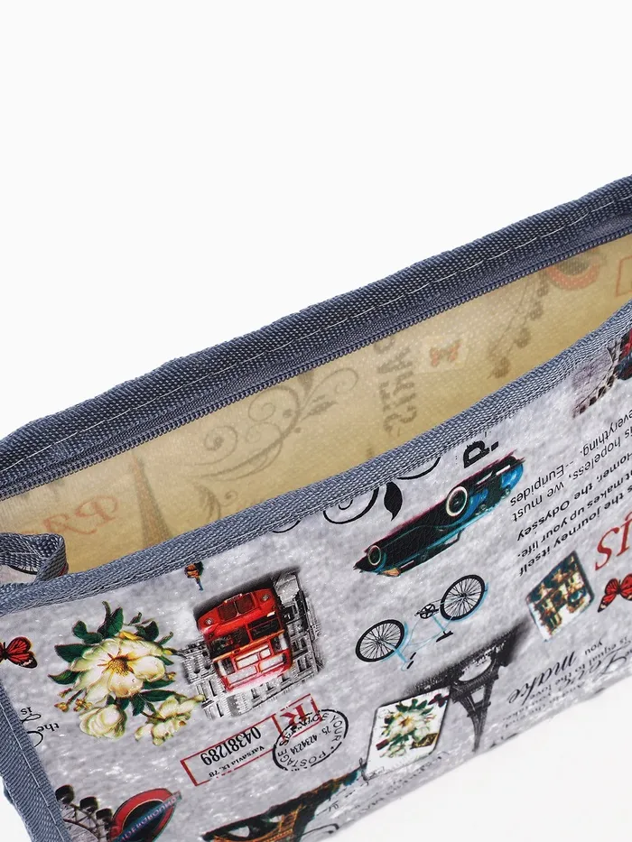 Стильная косметичка с парижским мотивом в сером цвете — практичное решение для хранения косметики. Изделие из искусственной кожи среднего размера с рисунком «Парижское настроение» сочетает функциональность и элегантность.