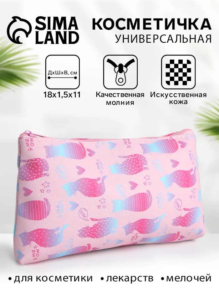 Косметичка-пенал на молнии плоская, маленькая, с рисунком «Кошки», розовая — Характеристики