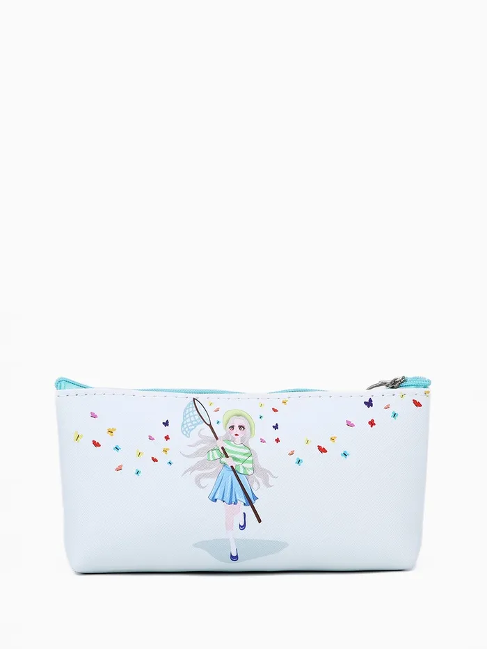 Косметичка-пенал на молнии, плоская, с рисунком, голубая/разноцветная