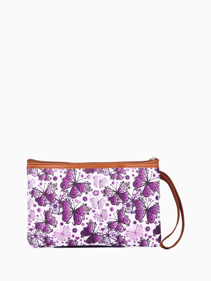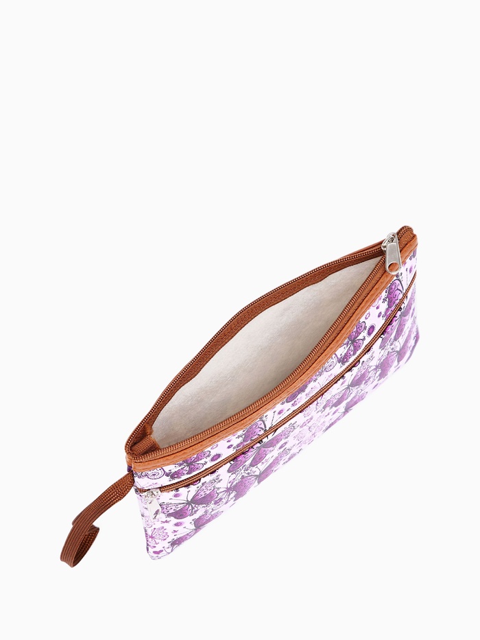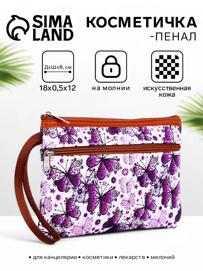 Косметичка-пенал на молнии, плоская, с ручкой, с карманом, с рисунком «Бабочки», фиолетовая — Характеристики