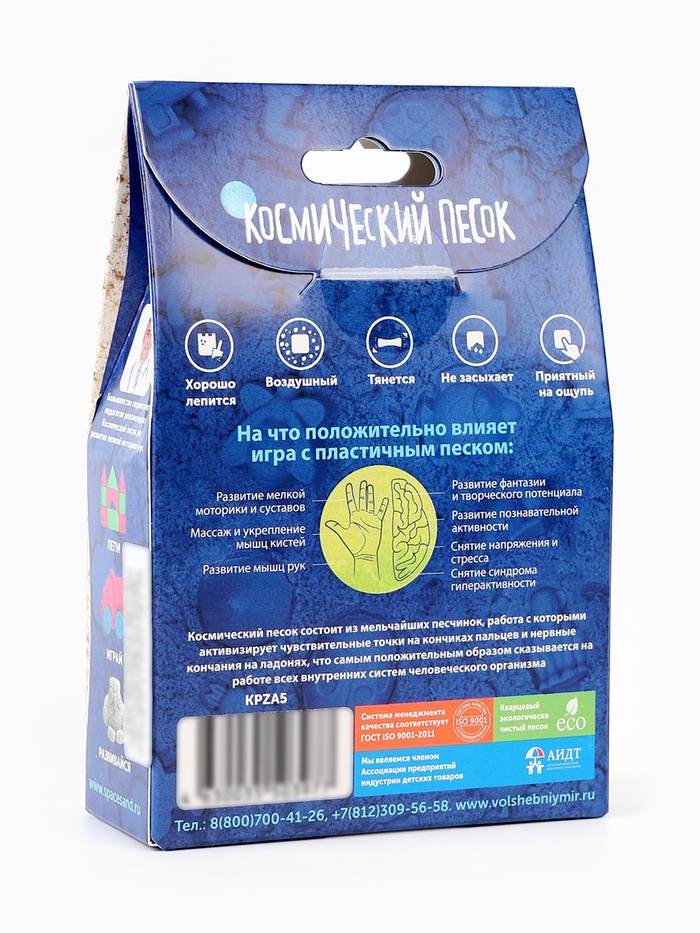 Играть с космическим песком ребёнок сможет когда и где захочет. Материал не прилипает к рукам и легко убирается со всех поверхностей. А удобная упаковка позволяет компактно хранить песок и избегать его загрязнения.