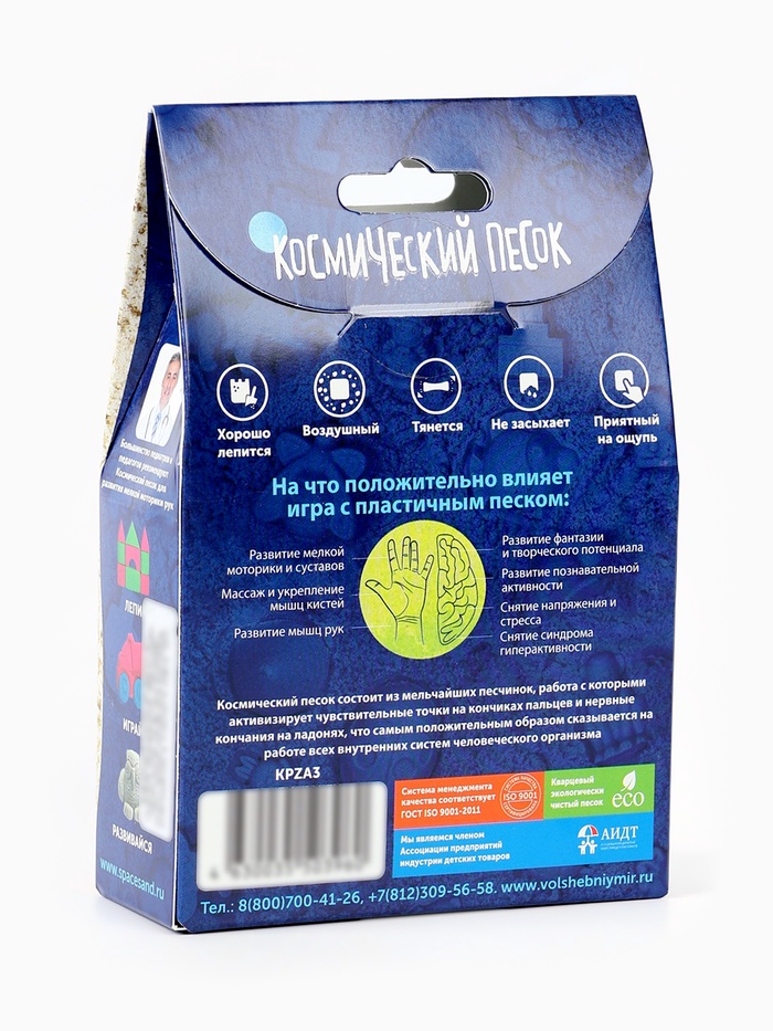 Играть с космическим песком ребёнок сможет когда и где захочет. Материал не прилипает к рукам и легко убирается со всех поверхностей. А удобная упаковка позволяет компактно хранить песок и избегать его загрязнения.