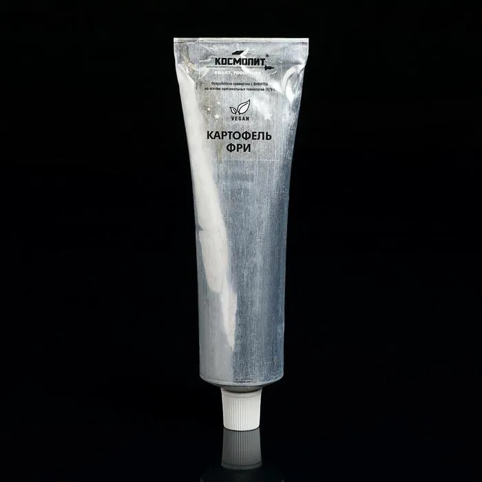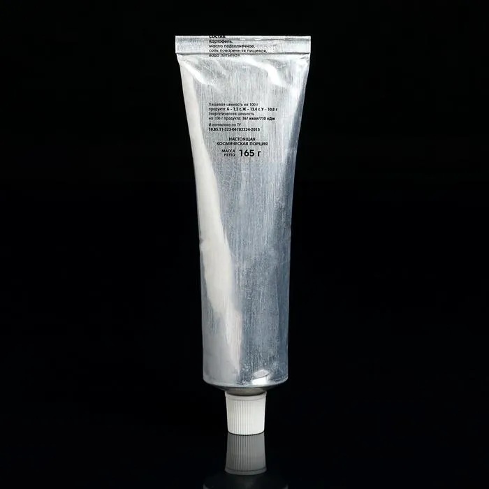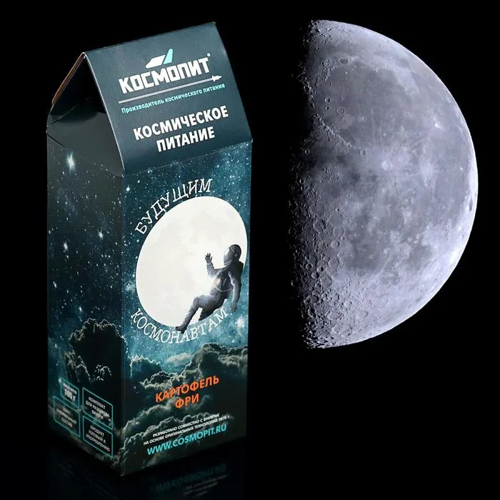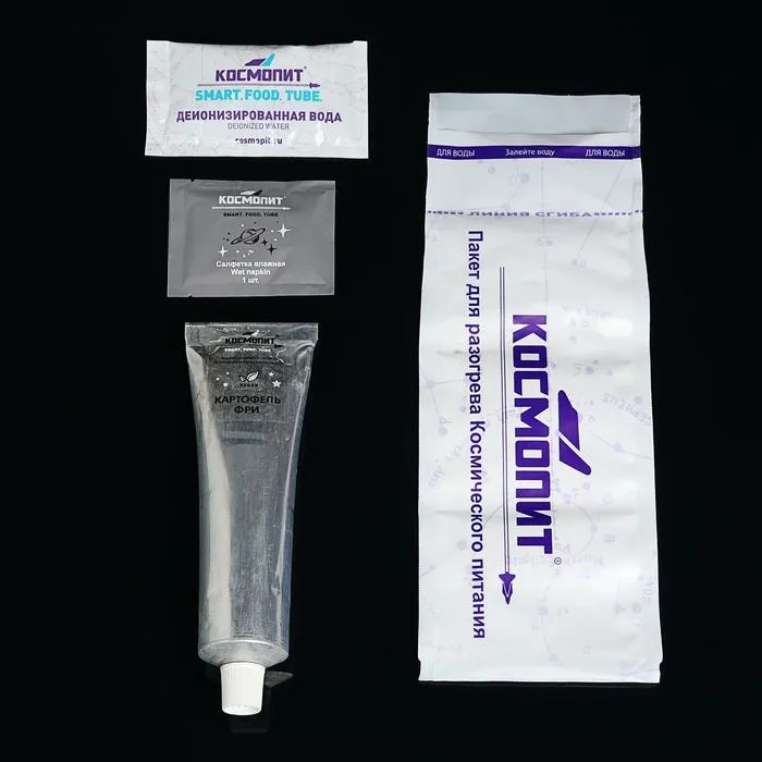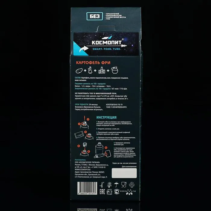 По составу космический картофель фри почти не отличается от привычной земной . Но сытное космическое блюдо в компактном алюминиевом тюбике можно взять с собой куда угодно. Упаковка, в которую помещается 165 граммов еды, не боится коррозии и перепадов температуры. Она не требует холодильника. Даже если вы оставите тюбик на жаре, его герметичность не даст содержимому испортиться. И через год блюдо будет всё ещё готово к употреблению.