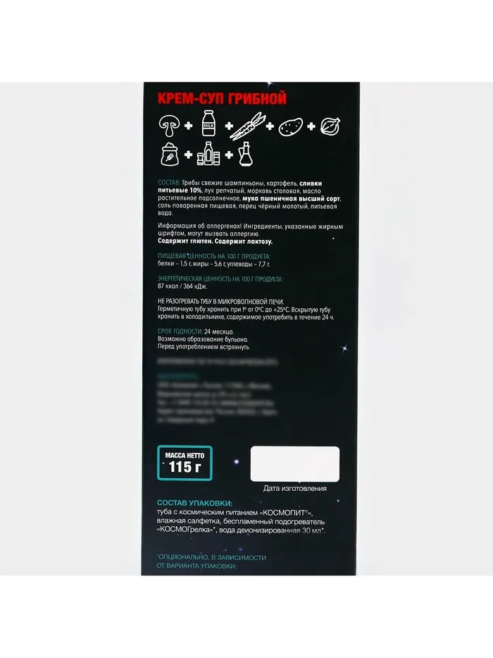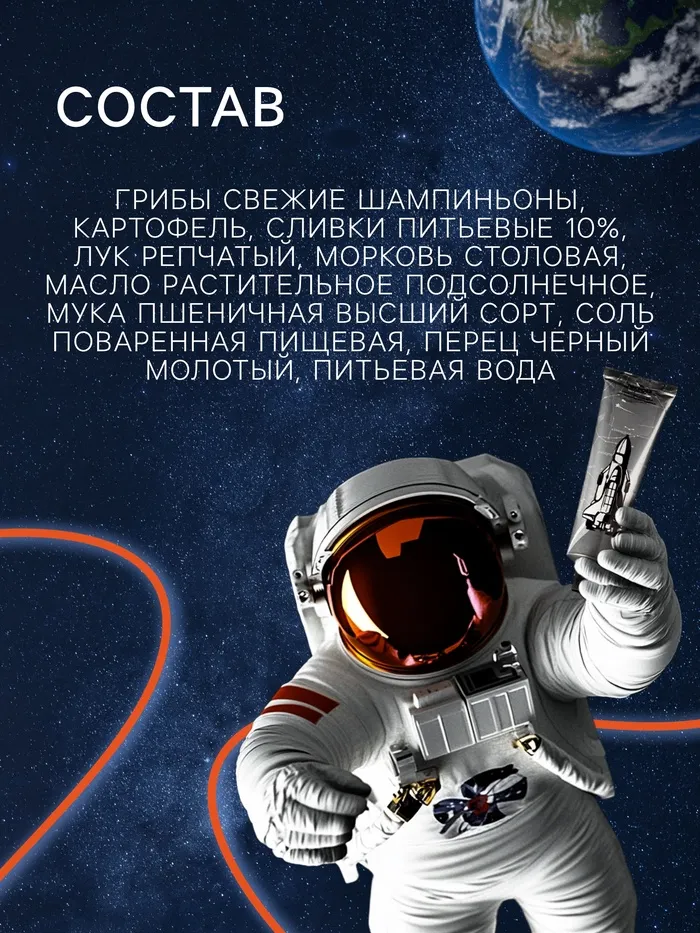 Состав космического грибного крем-супа: грибы свежие (шампиньоны), картофель, лук репчатый, морковь столовая, масло подсолнечное, соль поваренная пищевая, перец чёрный молотый, мука пшеничная высший сорт, сливки 10%, питьевая вода