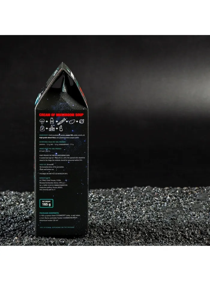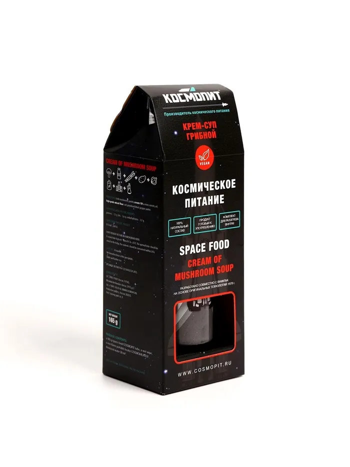 По составу экзотический грибной суп не отличается от привычного земного. Но сытное космическое блюдо в компактном алюминиевом тюбике можно взять с собой куда угодно. Упаковка, в которую помещается 165 граммов крема-супа, не боится коррозии и перепадов температуры. Она не требует холодильника. Даже если вы оставите тюбик на жаре, его герметичность не даст содержимому испортиться. Через год блюдо будет всё также готово к употреблению.