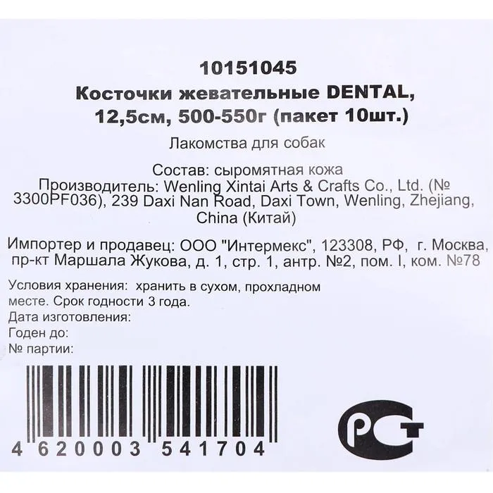 Кость из жил DENTAL, для собак, 12.5 см, 50-55 г, 10 шт. — Характеристики