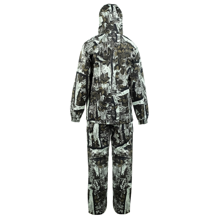 Костюм состоит из прямой удлинённой куртки с капюшоном и брюк.