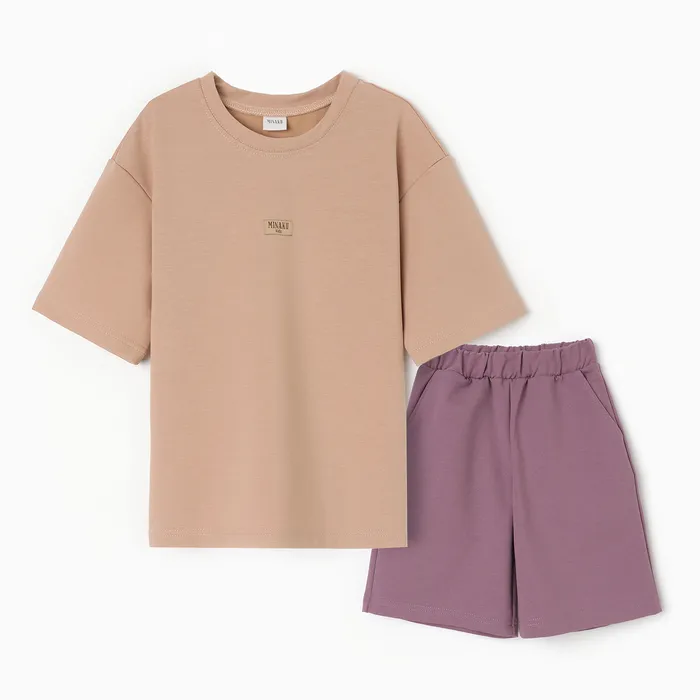 Костюм для девочки (футболка, шорты) MINAKU, бежевый/ пыльно-сиреневый, рост 146 см — Характеристики