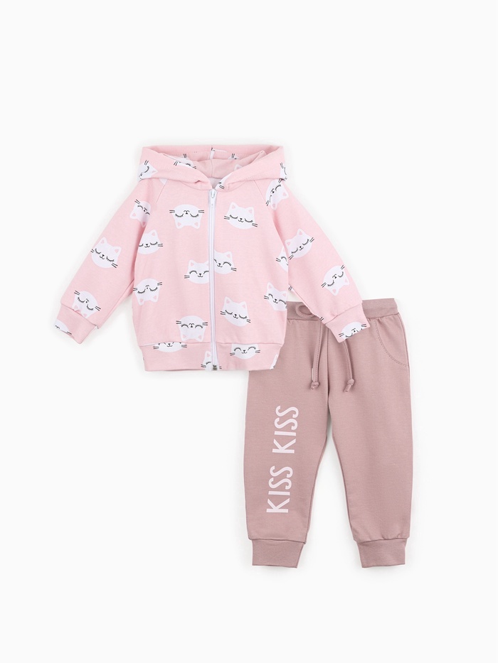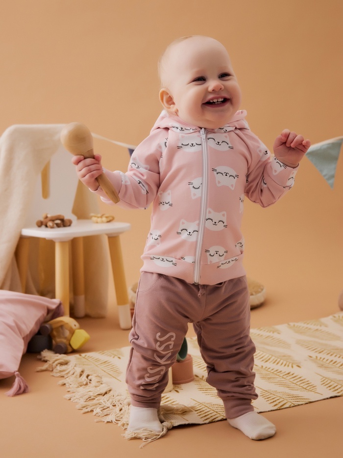 Детский комплект «Крошка Я Киса» с худи и брюками — уютный ансамбль для маленьких непосед. Нежная розово-лиловая гамма и милый дизайн создают настроение для повседневных приключений.