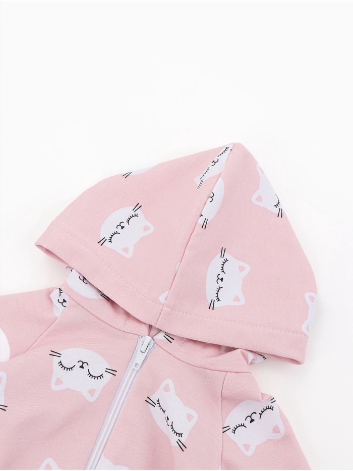 Набор подходит детям ростом 92-98 см — идеальный вариант для активных прогулок, посещения детского сада или домашних игр. Дизайн с кошачьим принтом особенно понравится маленьким любителям животных.