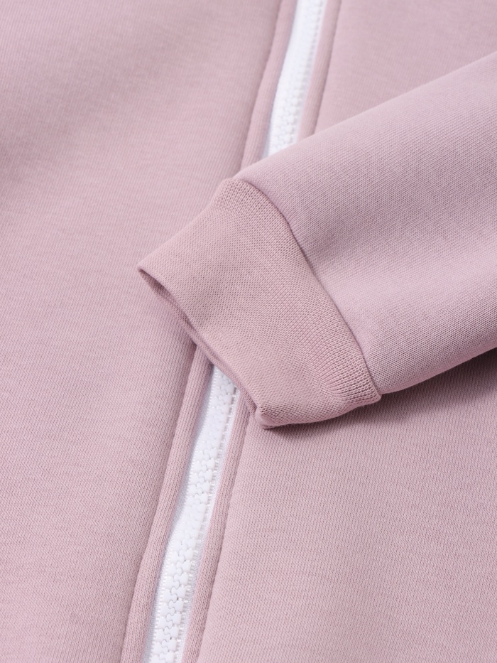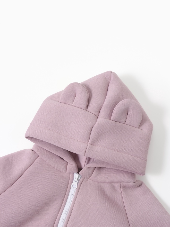 - Дизайн и функциональность: комплект имеет однотонный розовый цвет, дополнен оригинальными манжетами, нашивкой и ушками — всё, что делает образ милым и ярким.
