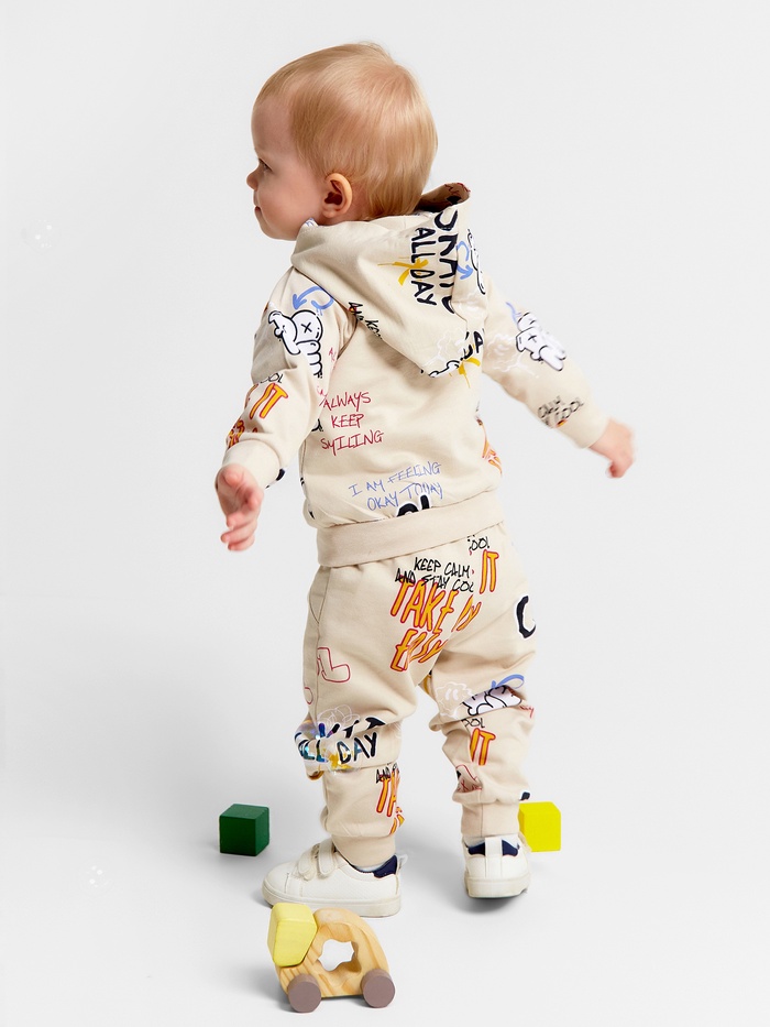 Стиль большого города для самых маленьких! Детский комплект «Граффити» (толстовка и брюки) — это практичная и модная одежда для мальчика. Яркий принт с надписями и цифрами создает настроение свободы и творчества.