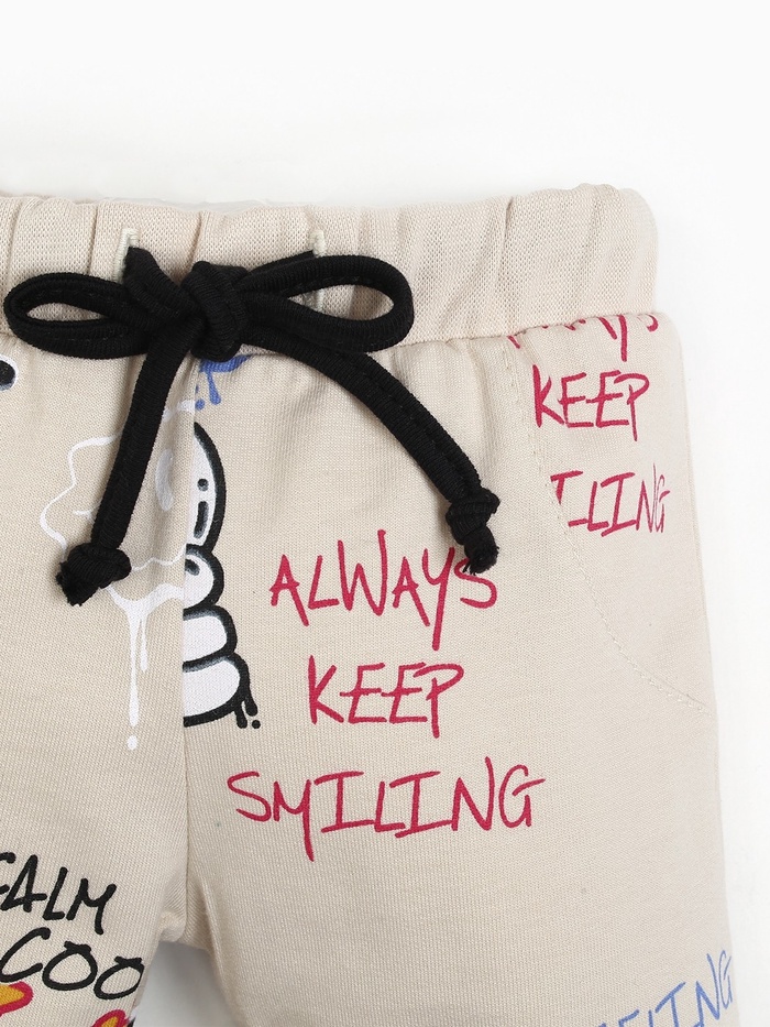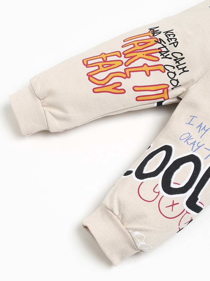- Повседневный стиль с характером: Графичные буквы и цифры на бежевом фоне выглядят современно. Комплект сочетается с любой обувью и верхней одеждой, подходит для прогулок, садика и встреч с друзьями.