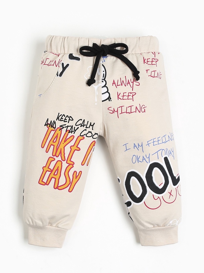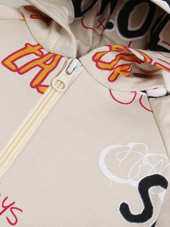 - Актуальный дизайн: Худи украшено графичными надписями и цифрами в стиле уличного граффити. Такой принт нравится мальчикам — он выглядит современно и по-взрослому. Бежевый оттенок сочетается с любой обувью и курткой.