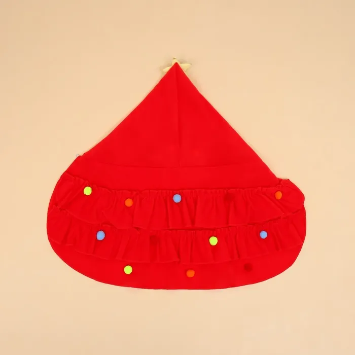 Костюм выполнен из мягкого, теплого материала, что делает его идеальным выбором для холодных дней. Яркий красный цвет с разноцветными помпонами, напоминающими елочные игрушки, создает атмосферу новогодних праздников, а декоративный элемент, такой как звезда, добавляет праздничного настроения.