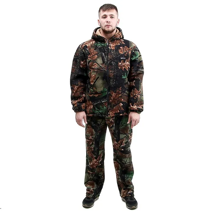 Флисовый костюм подойдёт для холодного времени года. Будет незаменим для походов, рыбалки, любых зимних видов спорта и других активных видов деятельности. Камуфляжная расцветка отлично подойдёт для маскировки.