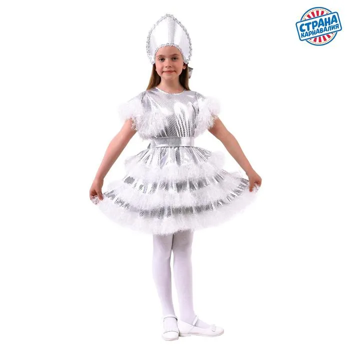 Карнавальный костюм «Снежинка» — это праздничный наряд для девочки, который идеально подойдет для новогодних утренников, тематических вечеринок или фотосессий. Костюм выполнен в серебристо-белой гамме, что подчеркивает зимнюю тематику и создает эффект настоящего снежного чуда.