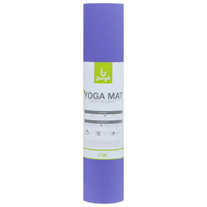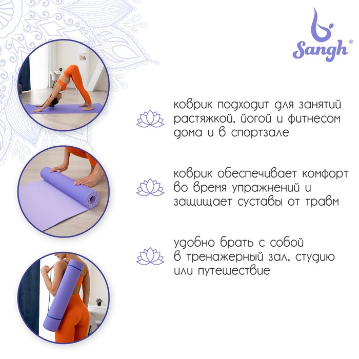 Коврик для йоги Sangh, нескользящий, 183×61×0.6 см, цвет сиреневый — Характеристики