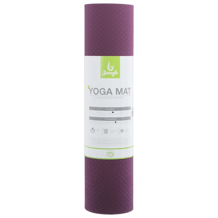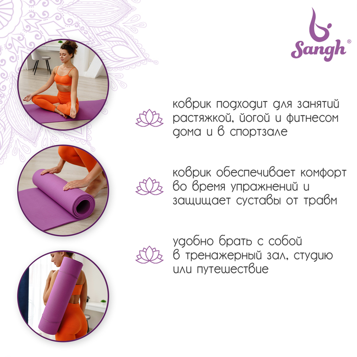 Коврик для йоги Sangh, нескользящий, 183×61×0.8 см, цвет фиолетовый — Характеристики