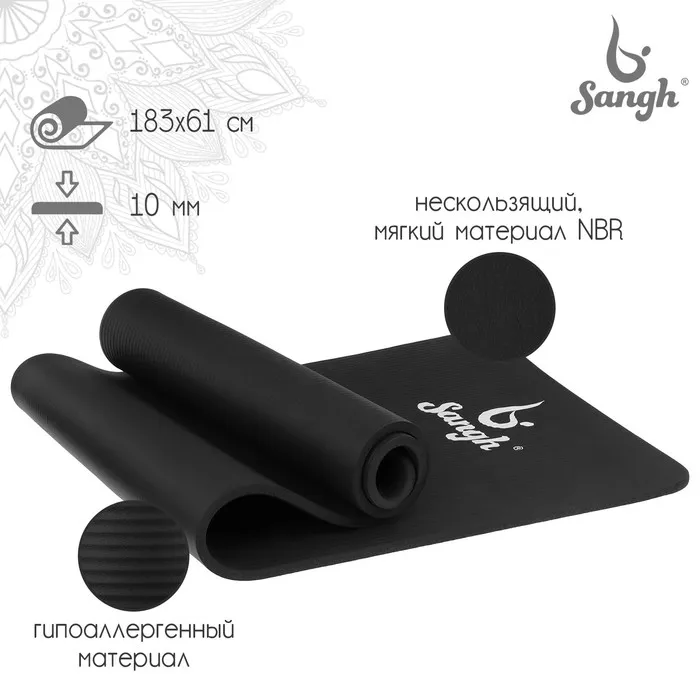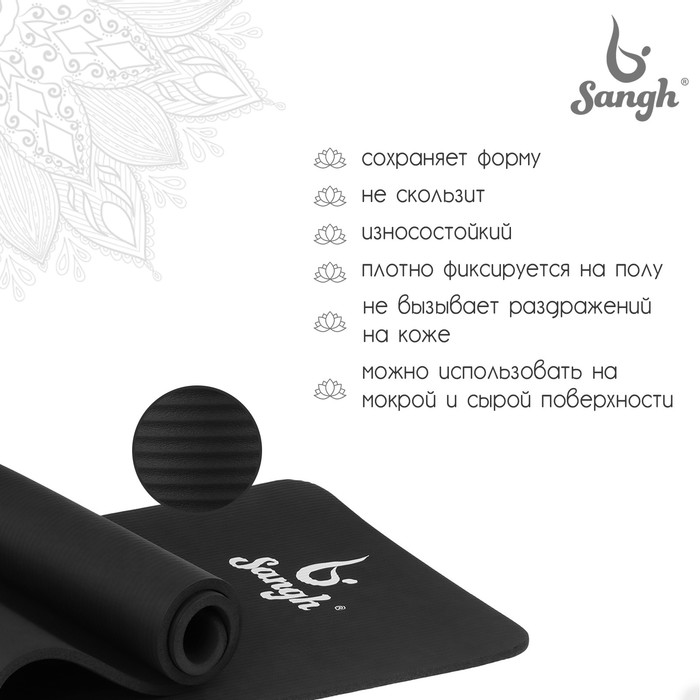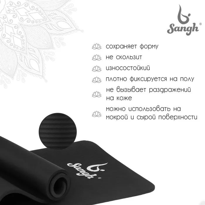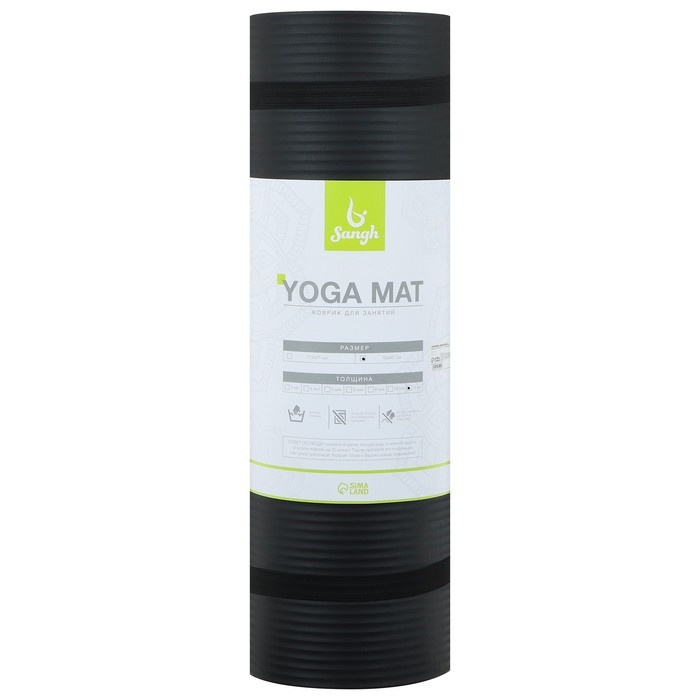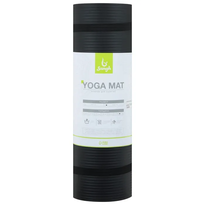 Коврик подходит для занятий йогой и фитнесом дома и в спортивных залах. Помогает в выполнении асан или других упражнений. Смягчает упор тела на твёрдую поверхность. Сохраняет форму после выполнения упражнений.