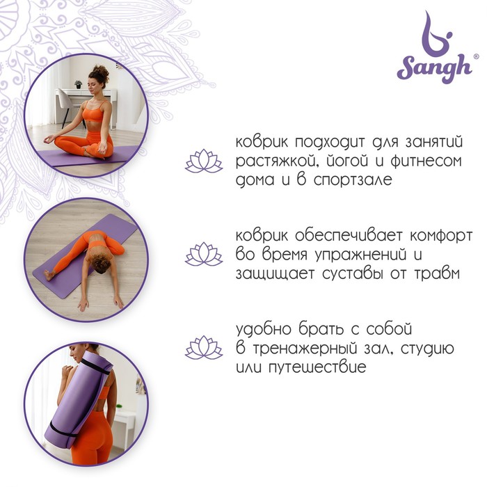 Коврик подходит для занятий йогой и фитнесом дома и в спортивных залах. Помогает в выполнении асан или других упражнений. Смягчает упор тела на твёрдую поверхность. Сохраняет форму после выполнения упражнений.