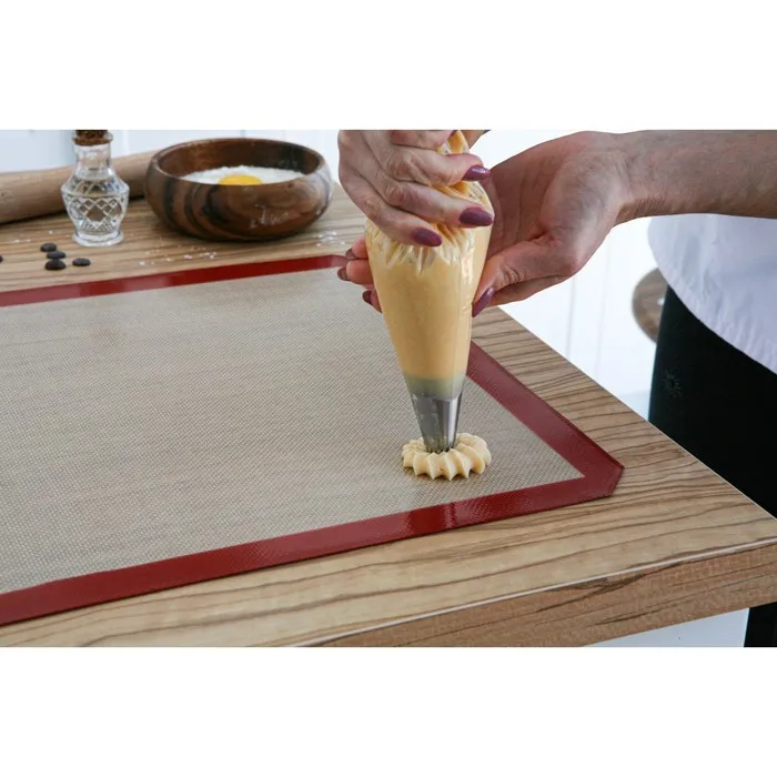 Армированный кондитерский коврик изготовлен из пищевого силикона и усилен изнутри частицами стекловолокна. Он прослужит дольше обычного коврика, т. к. выдерживает высокую и низкую температуру.