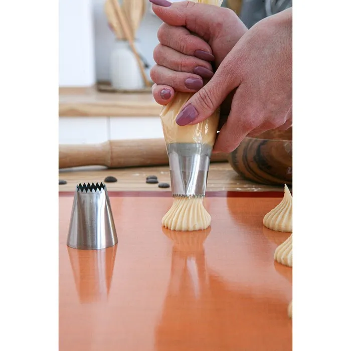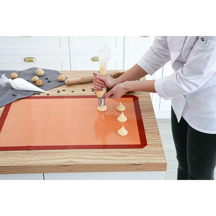 Армированный кондитерский коврик изготовлен из пищевого силикона и усилен изнутри частицами стекловолокна. Он прослужит дольше обычного коврика, т. к. выдерживает высокую и низкую температуру.