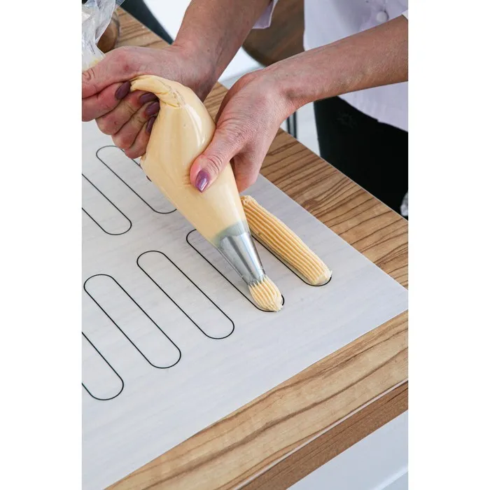 Армированный кондитерский коврик KONFINETTA изготовлен из пищевого силикона и усилен изнутри частицами стекловолокна. Идеален для приготовления эклеров. Он прослужит дольше обычного коврика, т. к. выдерживает высокую и низкую температуру.