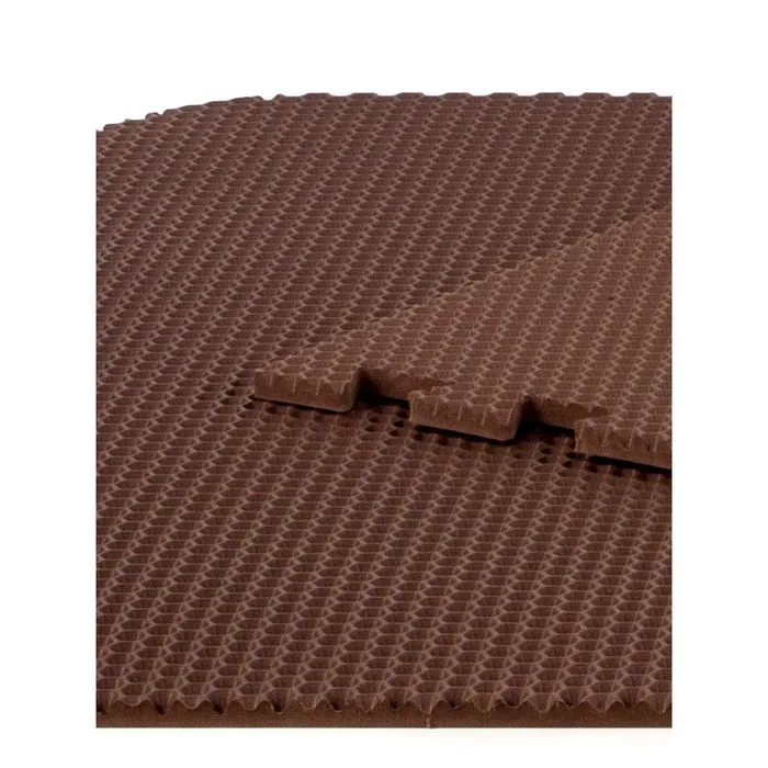 Материал ЭВА (этиленвинилацетат) не впитывает воду, не боится мороза, устойчив к воздействию бытовой химии и дорожных реагентов, не имеет запаха и абсолютно безвреден, так как имеет допуск для контакта с пищевыми продуктами и гигиенический сертификат. Можно вырезать и уложить по месту будущей эксплуатации.