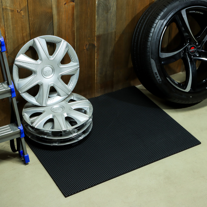 Материал ЭВА (этиленвинилацетат) не впитывает воду, не боится мороза, устойчив к воздействию бытовой химии и дорожных реагентов, не имеет запаха и абсолютно безвреден, так как имеет допуск для контакта с пищевыми продуктами и гигиенический сертификат. Можно вырезать и уложить по месту будущей эксплуатации.