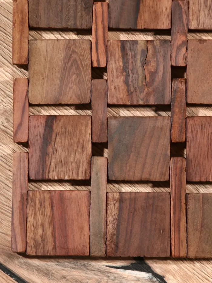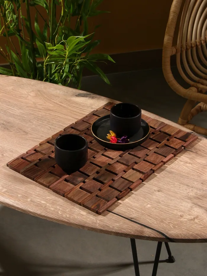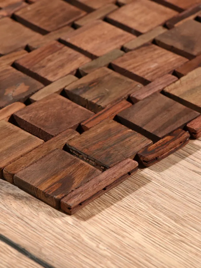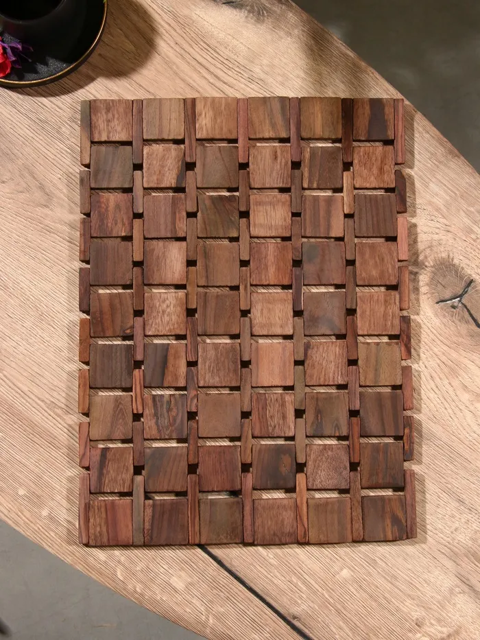 Коврик из тикового дерева, размером 40×30 см и толщиной 0.7 см, выполненный в благородном коричневом цвете. Изготовлен из натурального дерева, этот прямоугольный коврик отличается плетеной фактурой, добавляющей вашему дому нотки изящества и уникальности.
