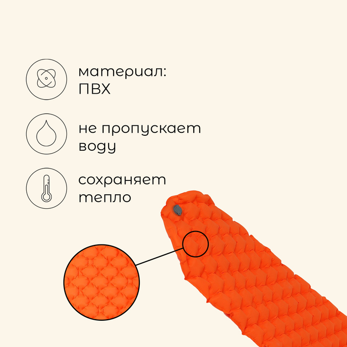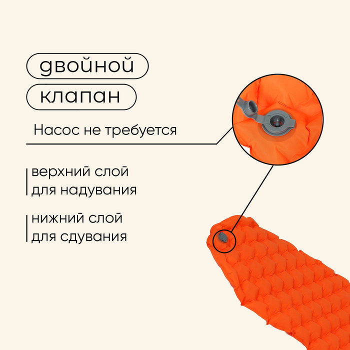 Ячеистая структура сохраняет и равномерно распределяет тепло, а также обеспечивает оптимальную поддержку во время сна. Водонепроницаемость и оптимальная толщина коврика позволяет удобно устроится на любой поверхности. Двойной клапан обеспечивает быстрое надувание - хватит всего 10-15 вдохов, насос не потребуется.