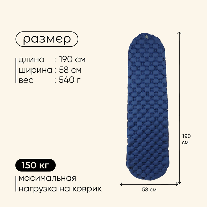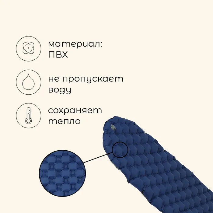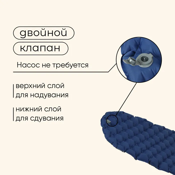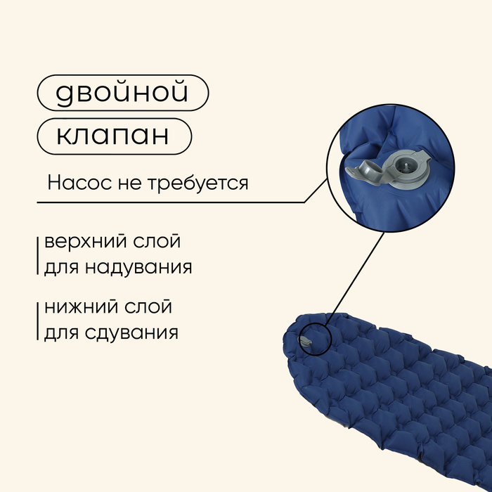 Ячеистая структура сохраняет и равномерно распределяет тепло, а также обеспечивает оптимальную поддержку во время сна. Водонепроницаемость и оптимальная толщина коврика позволяет удобно устроится на любой поверхности. Двойной клапан обеспечивает быстрое надувание - хватит всего 10-15 вдохов, насос не потребуется.