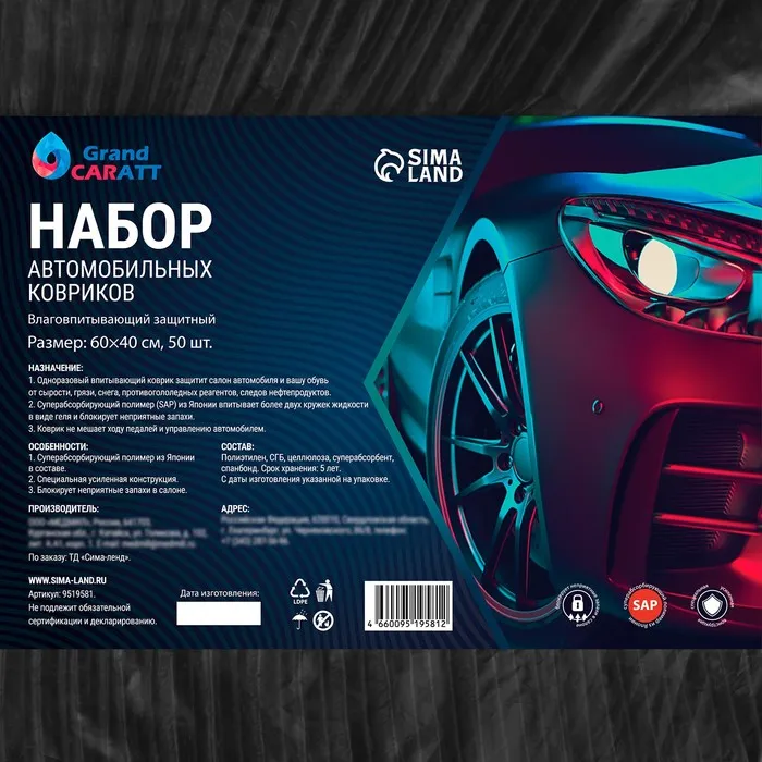 Одноразовый впитывающий коврик защитит салон автомобиля и вашу обувь от сырости, грязи, снега, противогололедных реагентов, следов нефтепродуктов. Суперабсорбирующий полимер (SAP) из Японии связывает более двух кружек жидкости в виде геля и блокирует неприятные запахи. Коврик не мешает ходу педалей и управлению автомобилем. Срок хранения: 5 лет.