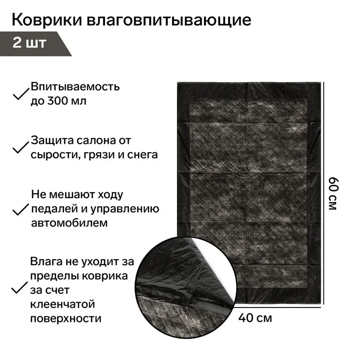 Одноразовый впитывающий коврик защитит салон автомобиля и вашу обувь от сырости, грязи, снега, противогололедных реагентов, следов нефтепродуктов. Суперабсорбирующий полимер (SAP) из Японии связывает более двух кружек жидкости в виде геля и блокирует неприятные запахи. Коврик не мешает ходу педалей и управлению автомобилем. Срок хранения: 5 лет.