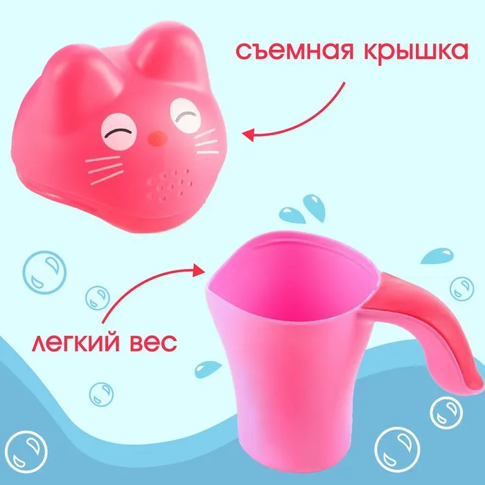 Ковш пластиковый для купания и мытья головы, детский банный ковшик «Котенок», 400 мл., с леечкой, розовый — Характеристики
