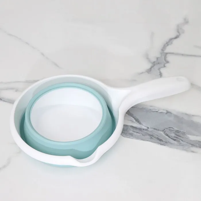 Чтобы разложить ковш надавите на дно рукой. Другой рукой возьмитесь за ручку и потяните основание движением на себя. Переверните ковш и проделайте то же самое, с другой стороны.