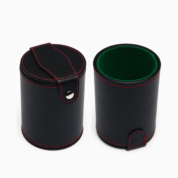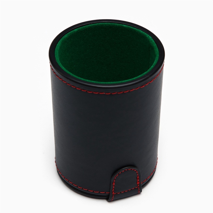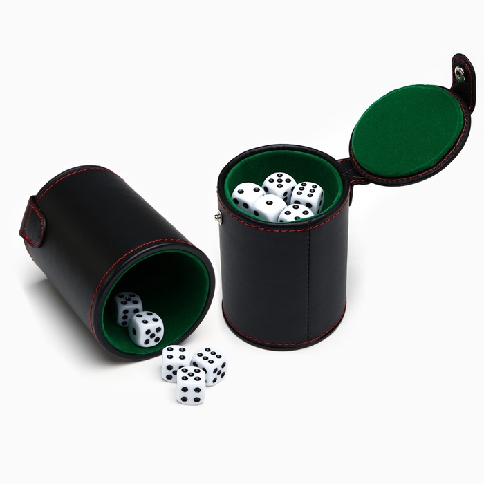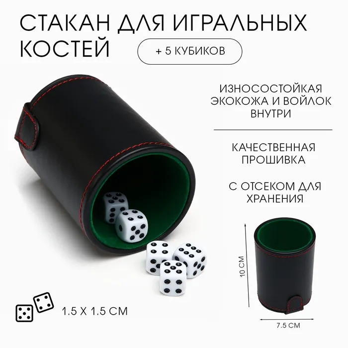 Cтакан для игры в кости — это стильный и функциональный аксессуар для любителей настольных игр. Изготовленный из высококачественной экокожи, он обеспечивает комфорт и надёжность во время игры. Внутри стакана находятся пять кубиков, выполненных в цвете слоновой кости. Благодаря удобной форме стакана и тщательно подобранным материалам, игра становится ещё более приятной и увлекательной.