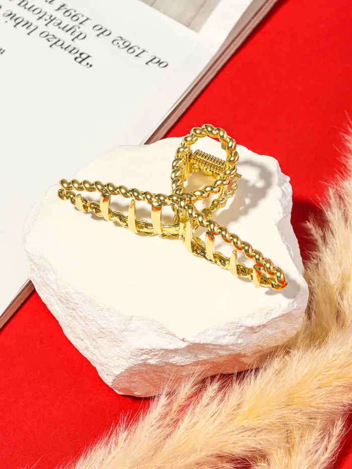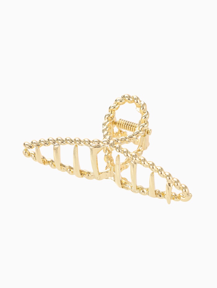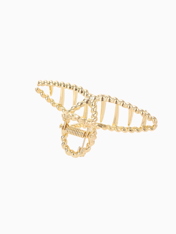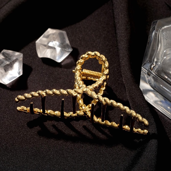 Элегантный металлический крабик для волос с плетёной петлёй и золотистым покрытием — это практичный и стильный аксессуар, который подчеркнет женский образ. Его длина 7,5 см позволяет надежно закрепить прическу, создавая аккуратный и изящный вид.