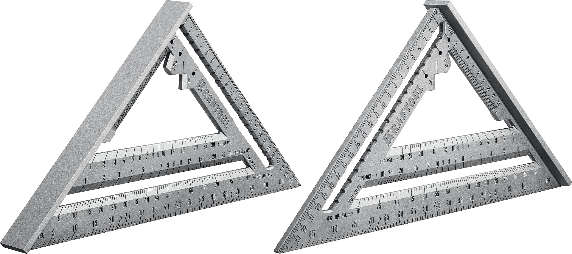 Высокоточный кровельный угольник - инструмент для разметочных работ и контроля перпендикулярности кровельных конструкций. Применяется в качестве торцовочного угольника, транспортира, рейсмуса и направляющей для пилы.