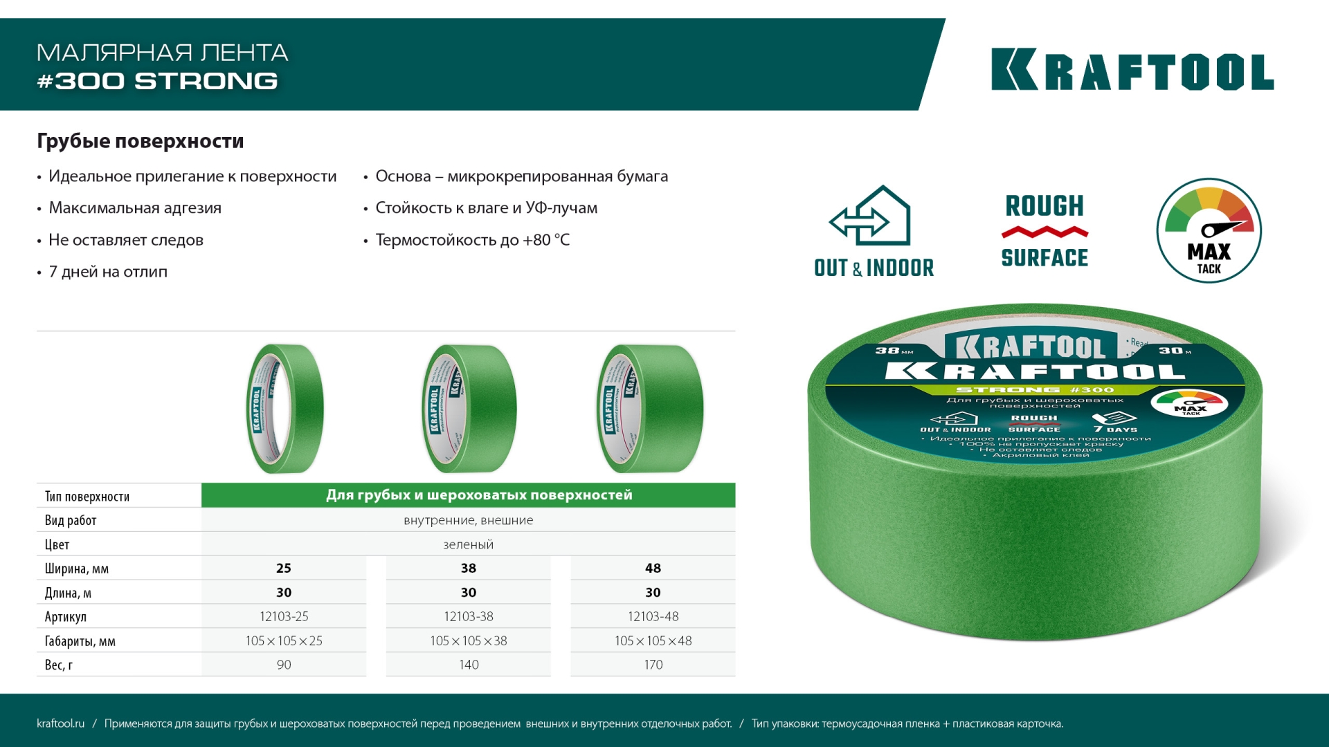 Малярная лента для грубых и шероховатых поверхностей предназначена для работы снаружи помещения с большинством материалов. Стоек к УФ-лучам, влаге, температуре до +80°С, надежно приклеивается к поверхности, позволяя получившейся линии быть максимально ровной, без подтеков краски. Легко удаляется, сохраняя первоначальный вид поверхности, не оставляя после себя следов клея.