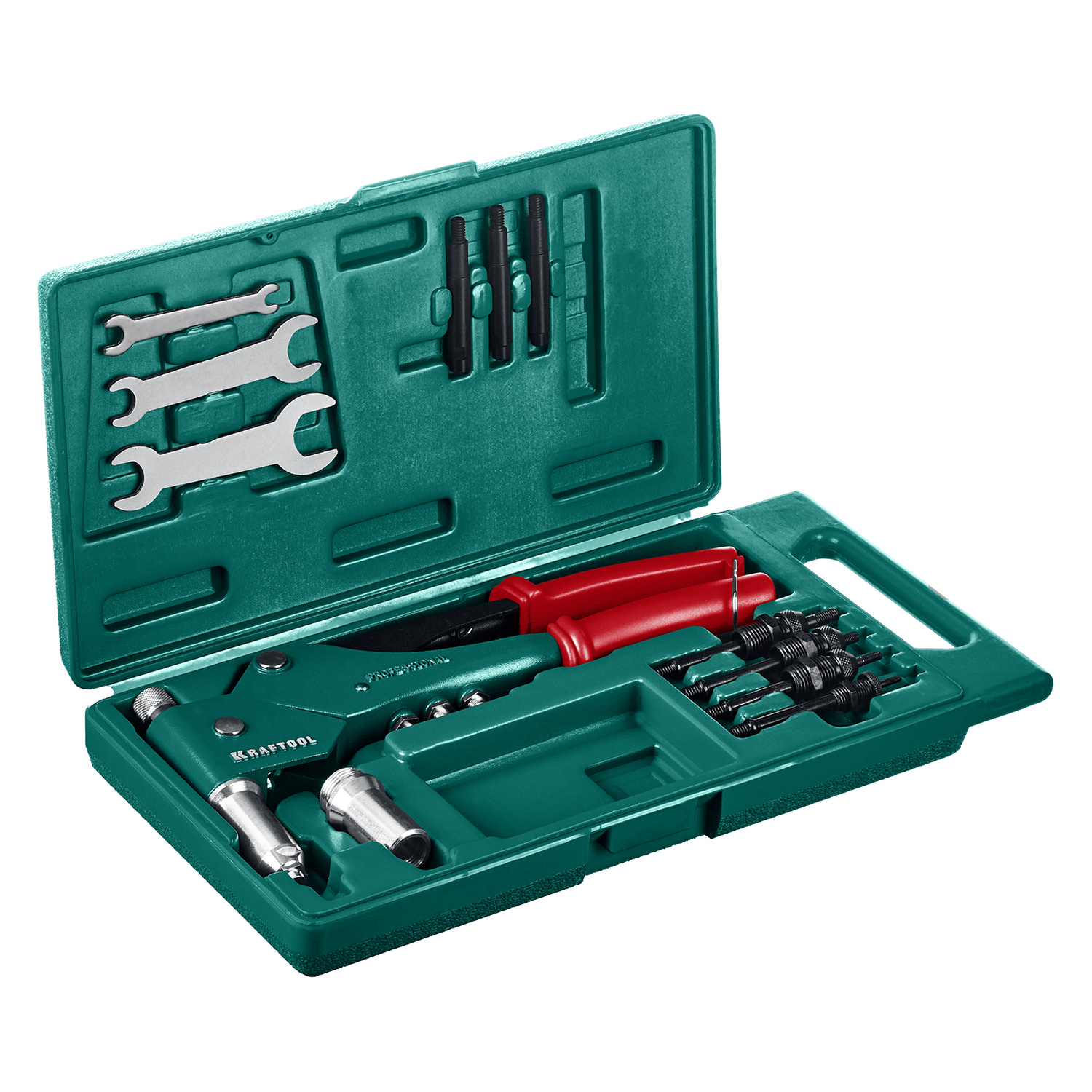 Комбинированный поворотный заклепочник KRAFTOOL выдерживает высокие рабочие нагрузки и предназначен для установки резьбовых штифтов, резьбовых и вытяжных заклепок из алюминия, стали и нержавеющей стали различных диаметров согласно вложенной таблице.